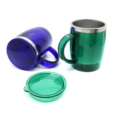 Canecas de Plástico Caneca plástica personalizada com acabamento inox internamente e revestimento exterior em ABS. Possui alça resistente, acabamento nas bordas em inox, e tampa protetora com anel de vedação. Capacidade para 400ml com interior térmico para conservar sua bebida saborosa por mais tempo. Ideal para brindes promocionais e ventos corporativos. 9,0 cm x 12,5 cm x 9,0 cm 254 g
