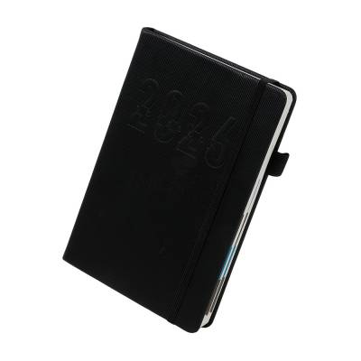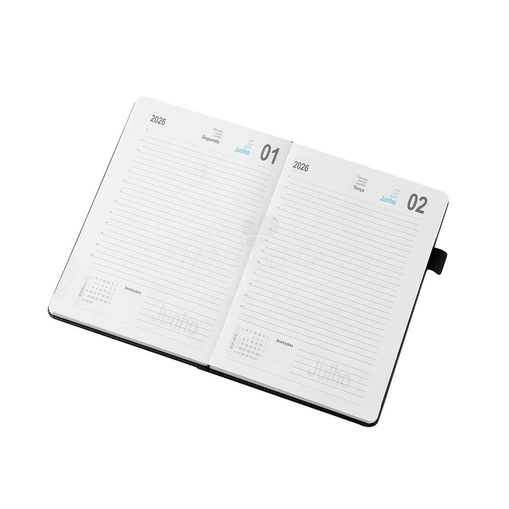 Agendas Agenda 2026 com capa dura em poliuretano (PU), marcador de páginas em cetim, porta-canetas e elástico para fechamento. Possui páginas dedicadas a dados pessoais, calendários de 2026 a 2028, lista de contatos e tabelas de pesos e medidas. 14,3 cm x 21,0 cm x 2,5 cm 484 g