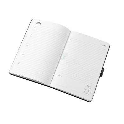 Agenda semanal com capa em poliuretano (PU) e fecho magnético. Contém páginas dedicadas a dados pessoais, calendários 2026 a 2028, planejamento diário de 2026 e lista de códigos DDI.