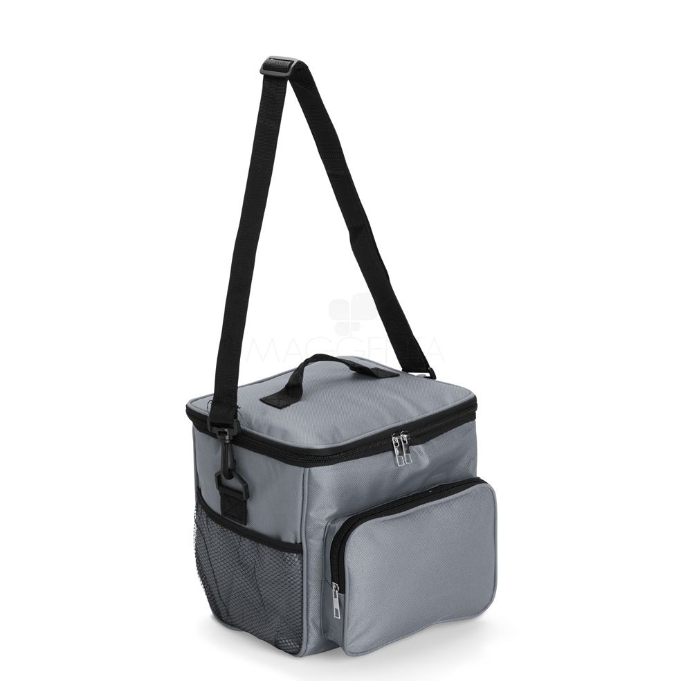 Bolsas Térmicas Bolsa térmica em Oxford resistente à água e com capacidade de até 11 litros. Seu revestimento interno em alumínio permite a conservação de temperatura de alimentos e bebidas por mais tempo. Possui também um bolso frontal e mais um par de bolsos laterais em tela de nylon, além de uma alça fixa na tampa e outra transversal. 25,0 cm x 22,0 cm x 16,0 cm 231 g