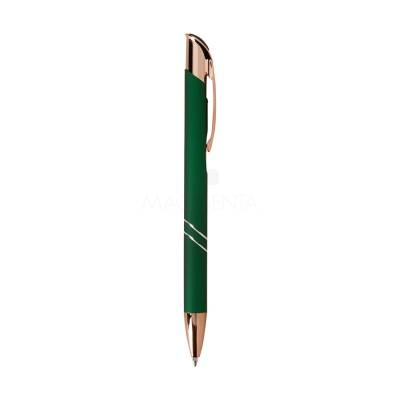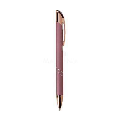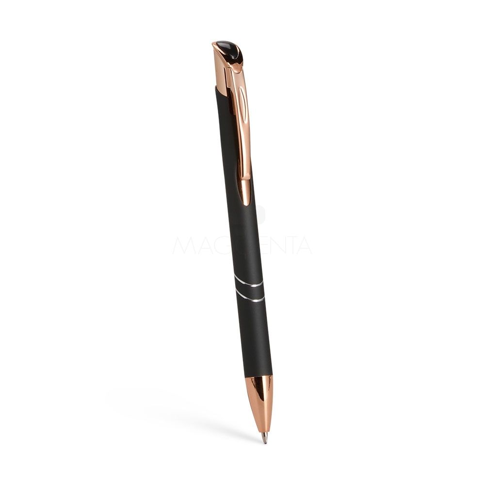 Caneta metálica com detalhes em plástico, acionamento por clique e carga esferográfica azul de 1.0mm, o que proporciona uma pegada leve e uma escrita precisa.