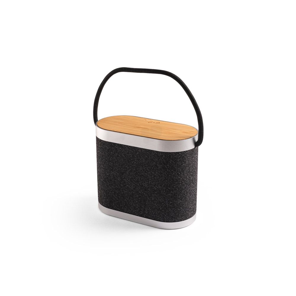 Caixa de som em bambu e poliéster 100% reciclado (rPET), com carregador por indução (wireless) na parte superior. Transmissão sem fios BT 5.3 e carregamento wireless com potência máxima de 15W, permitindo um carregamento super-rápido. Com potência sonora de 5W e bateria com capacidade de 1.200 mAh permite uma autonomia, aproximada, de 2h. Compatível com dispositivos móveis com tecnologia de carregamento sem fios. Incluso um cabo de carregamento USB-C.