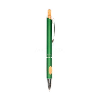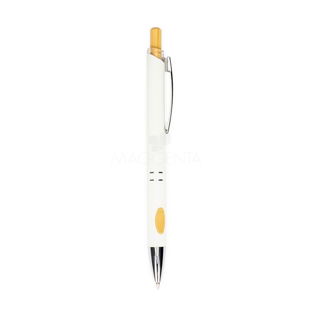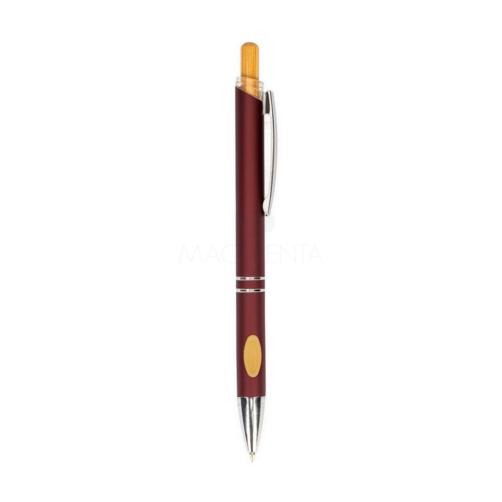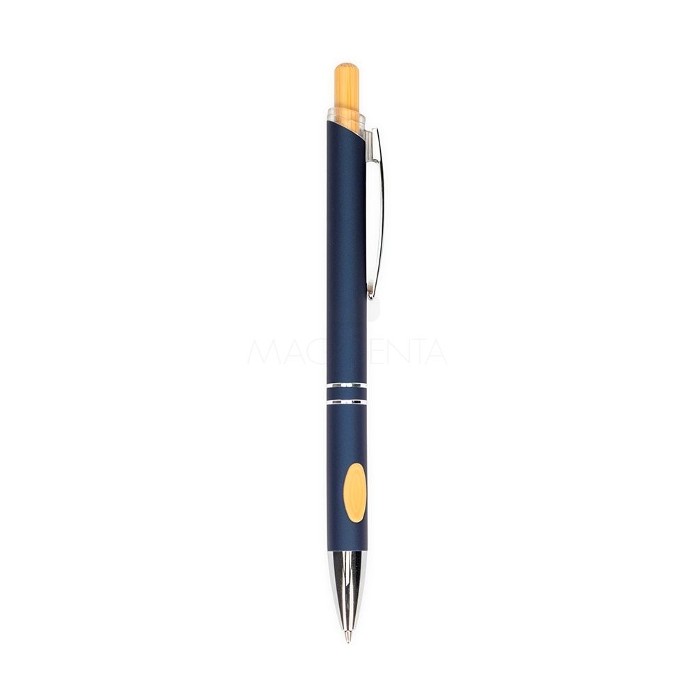 Caneta metálica com detalhes emborrachados no corpo, acionamento por clique com parte superior em bambu, carga esferográfica azul de 1.0mm, o que proporciona uma pegada leve e uma escrita precisa.
