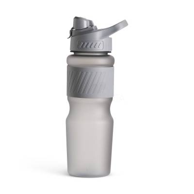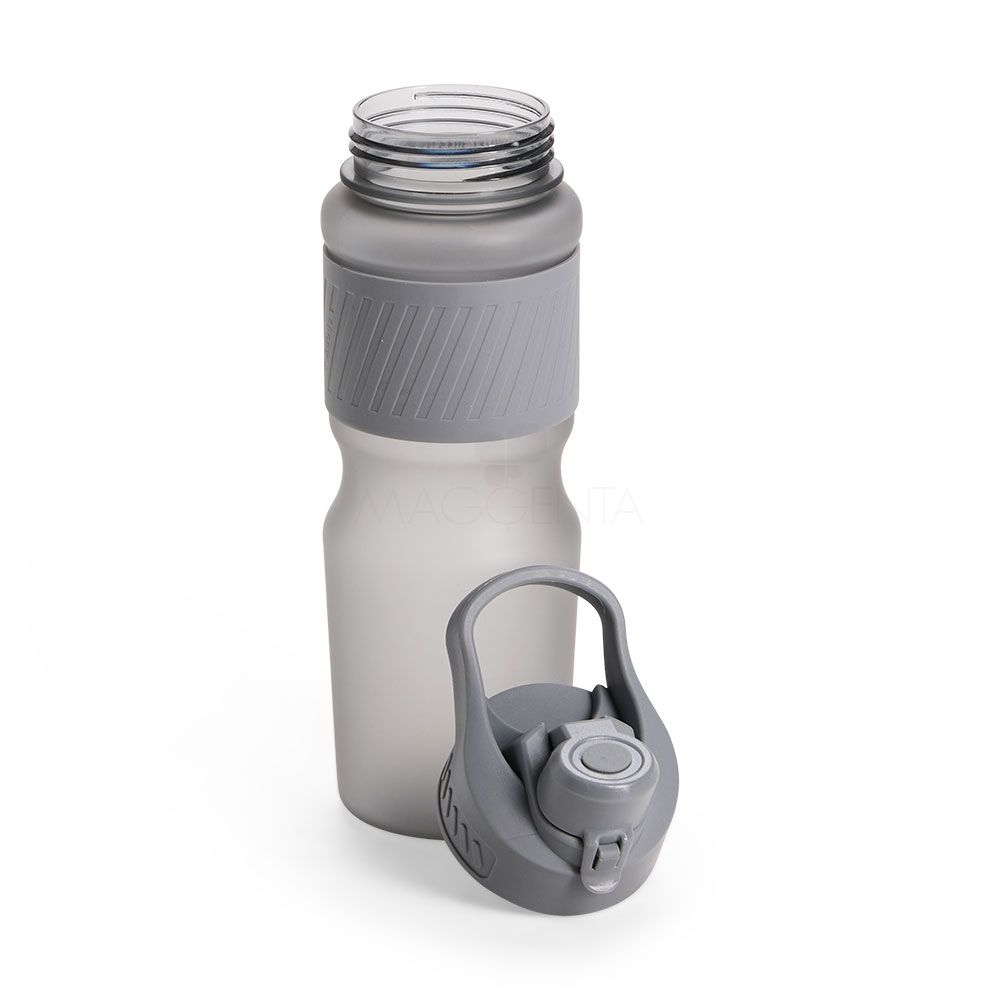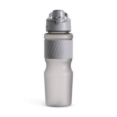 Squeeze plástico com acabamento fosco e capacidade de até 750ml. Possui luva emborrachada, tampa rosqueável com bocal e alça fixa para transporte. O bocal conta ainda com uma tampa de proteção com trava de segurança.