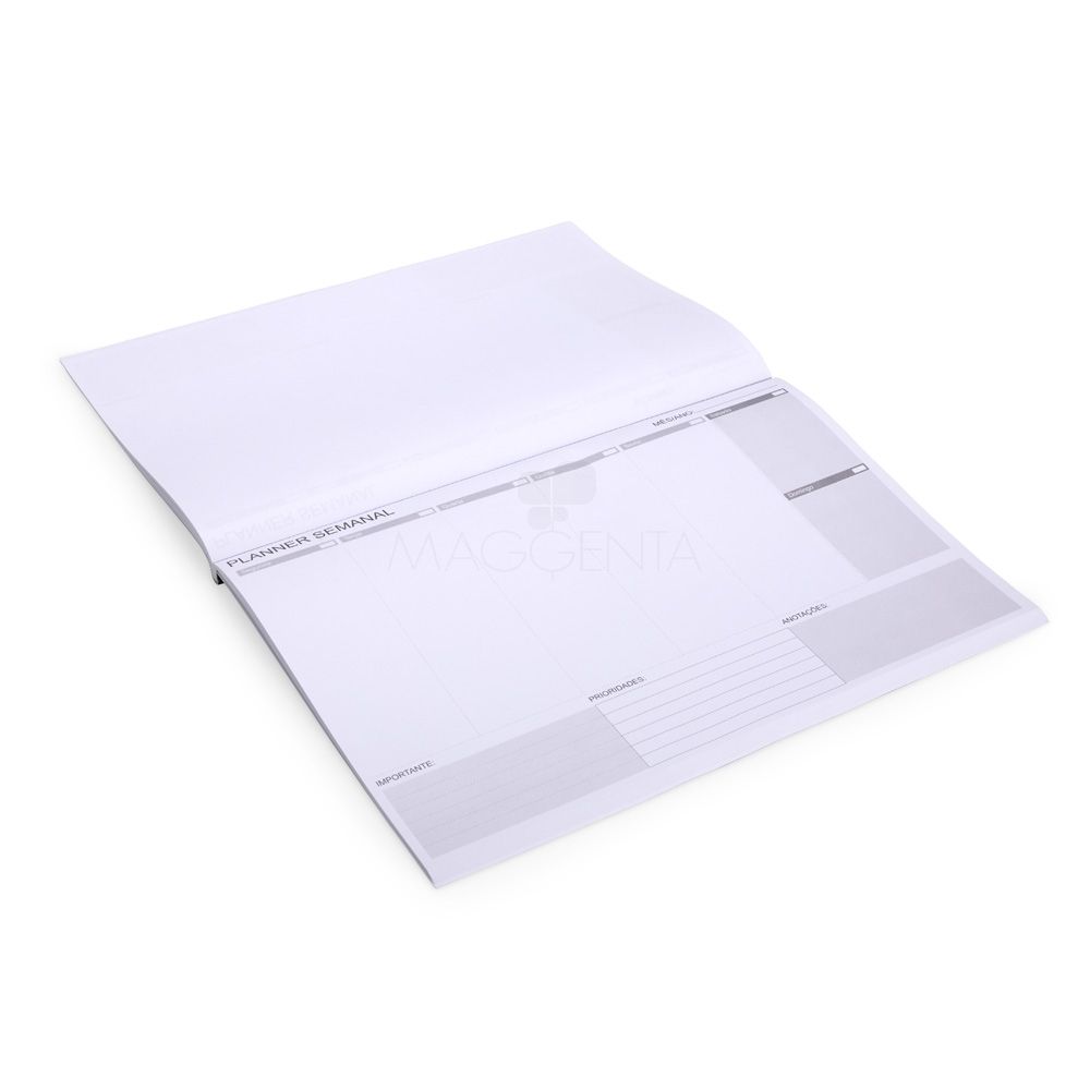Planner semanal com cerca de 55 folhas destacáveis para anotações e organização ao longo da semana.