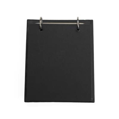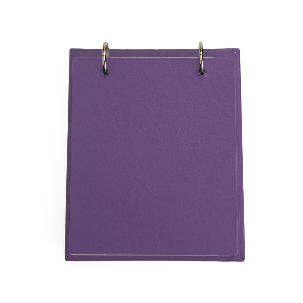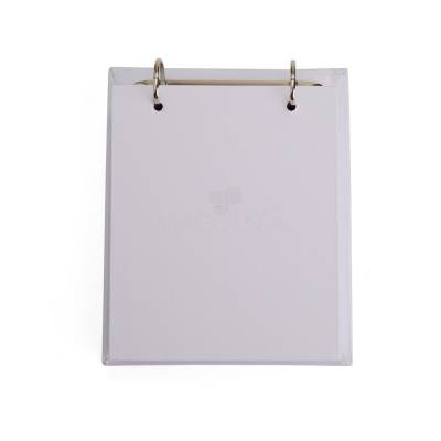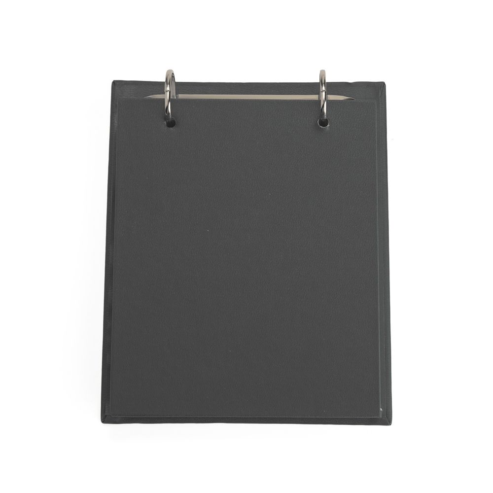 Bloco de anotações de mesa com trilho de ferro e capa dura em percalux. Possui aproximadamente 150 folhas brancas sem pauta com área destacável.