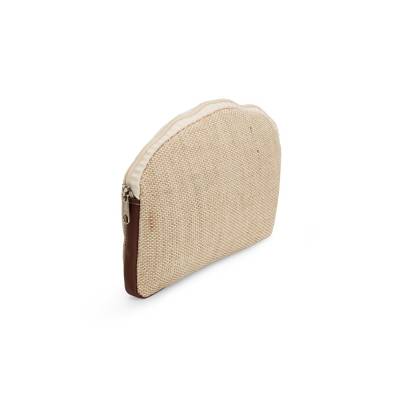 Nécessaire confeccionado em juta com fechamento em zíper e detalhes laterais em bidim.