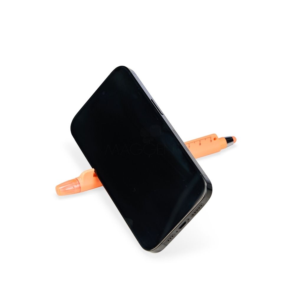 Caneta plástica marca-texto de ponta chanfrada com tampa protetora. Conta com uma régua de 9 centímetros e abridor de garrafas integrados ao corpo da caneta, além de uma caneta menor, destacável da estrutura principal, com ponteira emborrachada para interação com telas sensíveis ao toque e carga esferográfica azul de 1.0mm