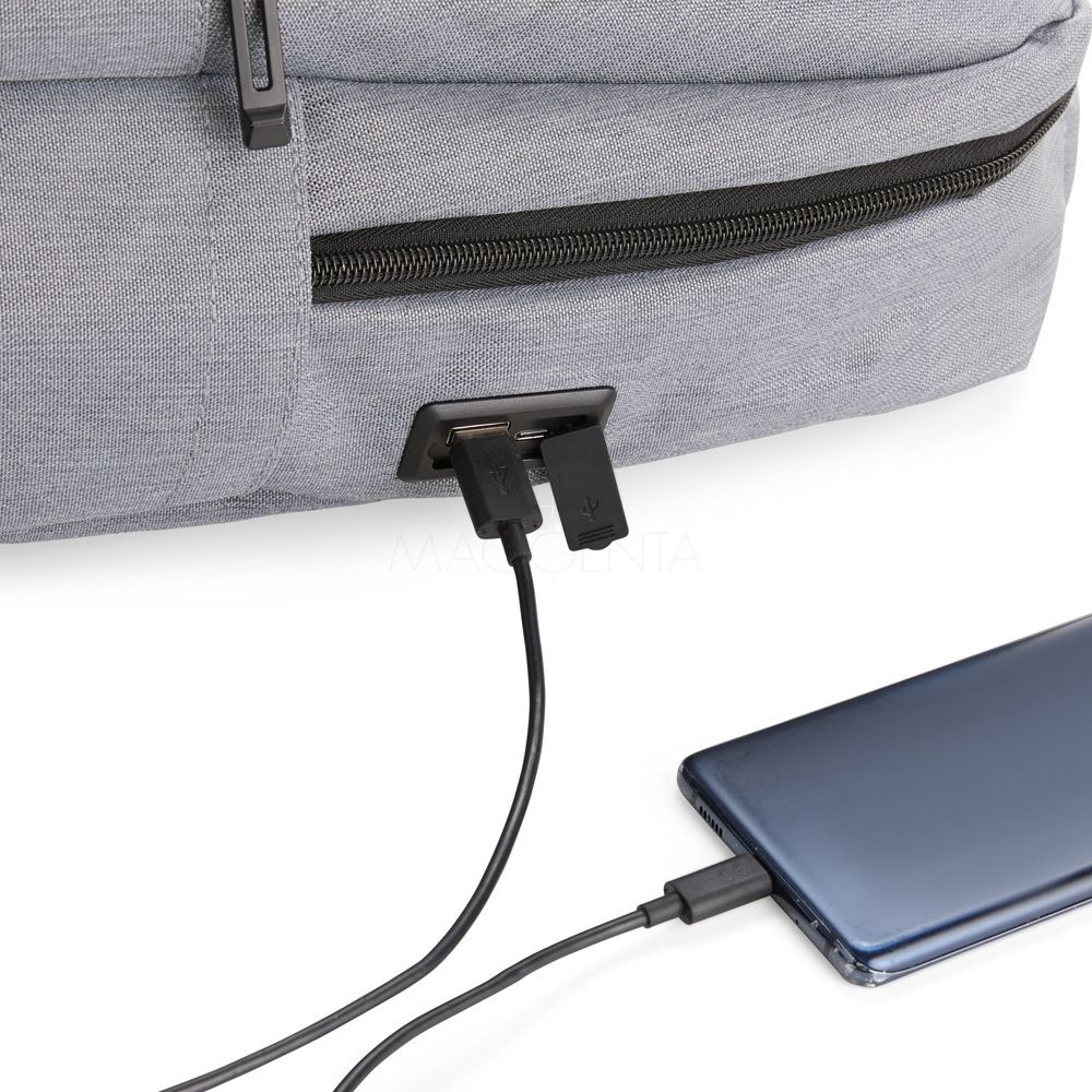 Mochila confeccionada em Oxford Jacquard impermeável com detalhes em couro sintético e capacidade de até 15,6 litros. Possui compartimento principal com bolsos em diferentes tamanhos e uma divisória para notebooks de até 15,3 polegadas. Conta com entrada externa para cabos USB-A e USB-C, dois compartimentos frontais com zíper e dois bolsos laterais abertos. Dispõe ainda de alça superior, duas alças de costas e painel traseiro acolchoados, além de engate em nylon para malas de viagem.