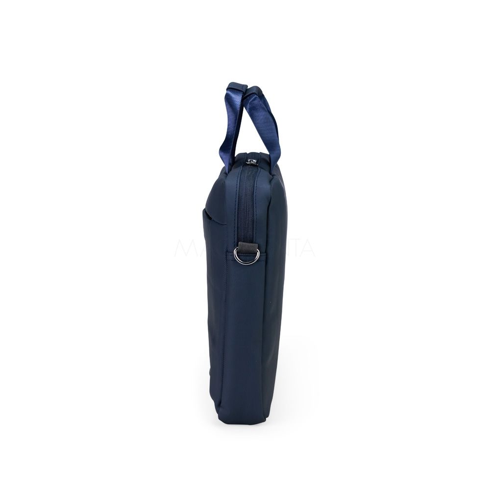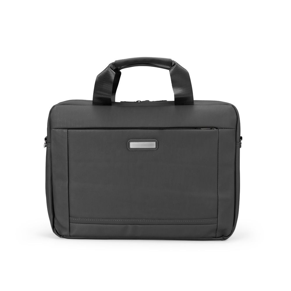 Pasta para notebook confeccionada em couro sintético impermeável com fechamento em zíper e capacidade para aparelhos de até 15,6 polegadas. Possui dois compartimentos: o principal, com revestimento acolchoado, quatro bolsos abertos de tamanhos diferentes e duas divisórias para canetas; e o frontal, com plaquinha metálica fixa na parte externa. Conta ainda com duas alças de mão e um par de abas metálicas para alças removíveis. Acompanha alça de ombro ajustável.