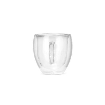 Caneca de vidro borossilicado com capacidade para até 150ml e estrutura de parede dupla, que ajuda a impedir o contato direto entre a temperatura do líquido e a parede externa da caneca.