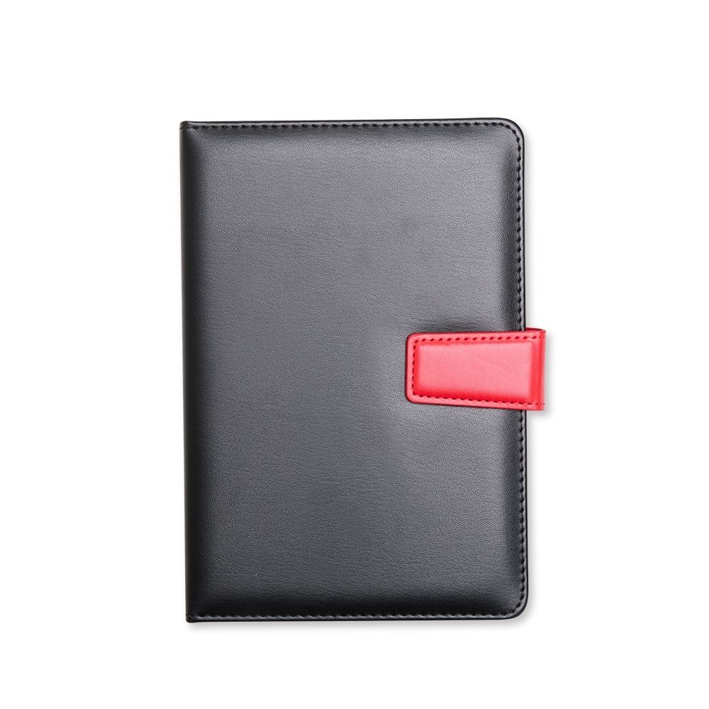 Kit executivo com duas peças, composto por uma caderneta de capa em couro sintético com fechamento magnético e cerca de 80 folhas pautadas, e uma caneta em metal com detalhes em plástico, ponteira emborrachada para uso em dispositivos touchscreen e carga esferográfica azul de 1,0 mm. Acompanha uma caixa de papelão com berço em espuma para a caneta.