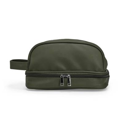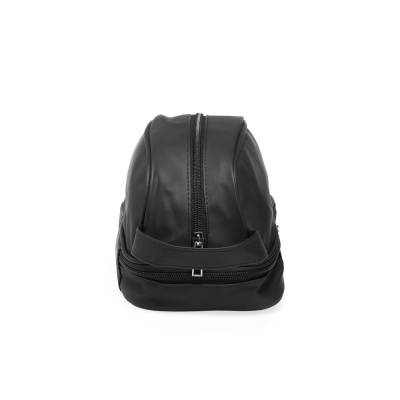 Nécessaire confeccionada em couro sintético impermeável. Possui alça lateral de mão e dois compartimentos com fechamento em zíper: o principal, na parte superior, e outro na parte inferior, ideal para guardar itens úmidos.