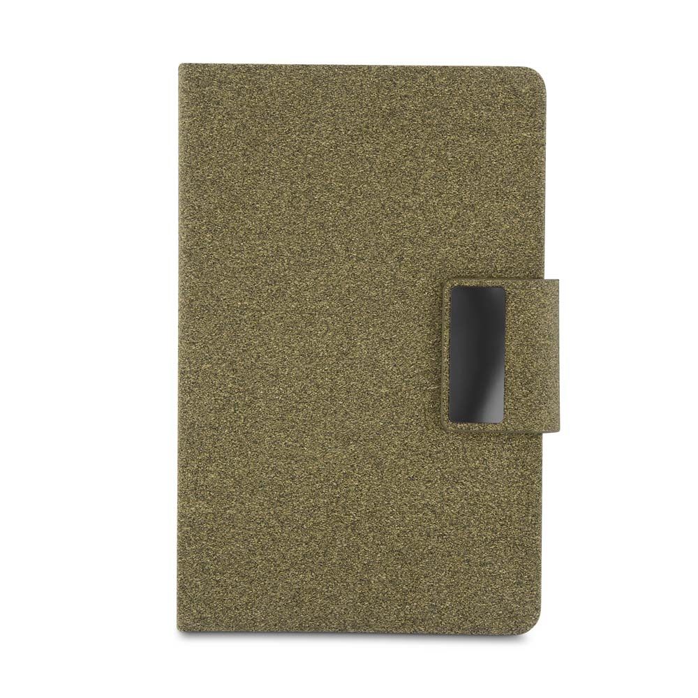 Caderno de anotações com capa em PU e fibra de chá ou café, 80 folhas 70 g/m², engate para caneta com fechamento magnético e placa de metal, não acompanha caneta.