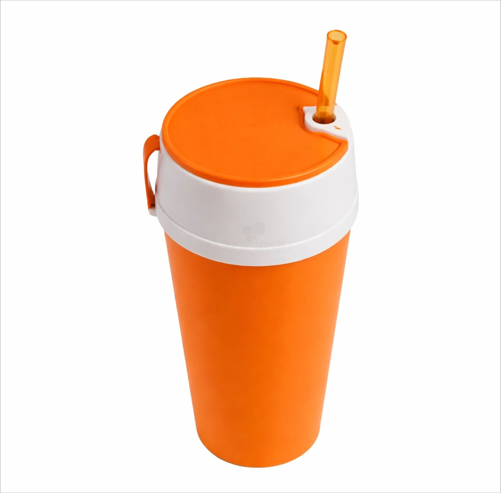 Copo 450ml personalizado com tampa porta snacks, desenvolvido em polipropileno durável, ideal para eventos corporativos, campanhas promocionais e ações sazonais. Seu design inovador com espaço para snacks agrega valor e diferenciação ao brinde, proporcionando praticidade no consumo de bebidas e alimentos. Permite personalização em silk screen ou transfer, sendo uma opção moderna e funcional para fortalecer a presença da sua marca.